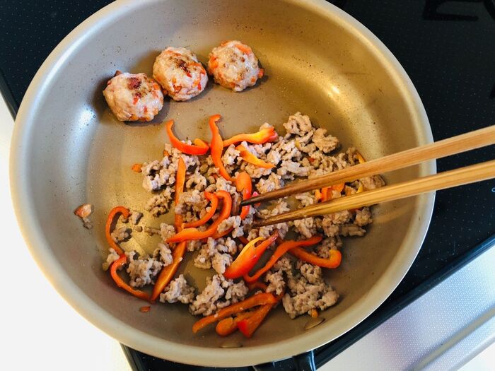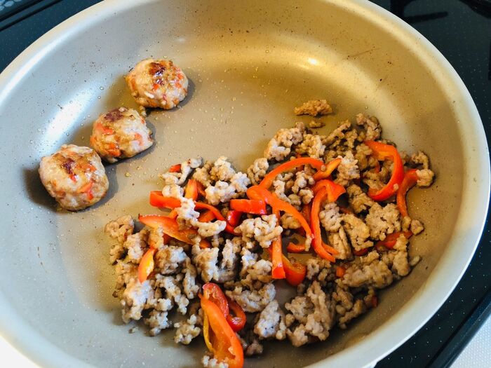 フライパンに油を入れ、丸めたものを転がしながら表面に焼き色がつくまで加熱したら、残りのひき肉とピーマンを加えて炒め合わせます。
