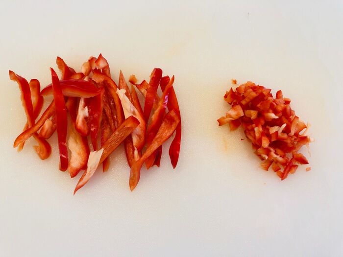 ピーマン2/3個を細切りに、1/3個をみじん切りにします。