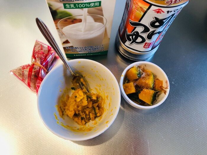 2/3を取り出して鰹節を振り、残りの1/3は牛乳を少々加えて潰したら完成です。
