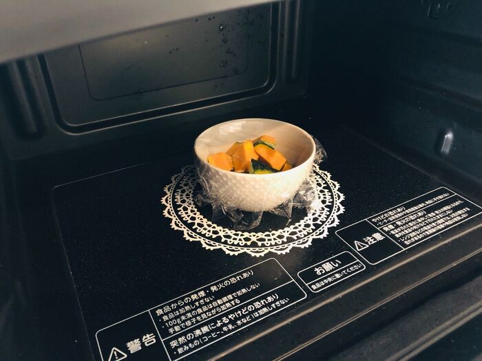 かぼちゃを一口サイズにカットして、耐熱皿に入れラップをかけたらレンジで柔らかくなるまでか加熱し、麺つゆをかけて混ぜ合わせます。