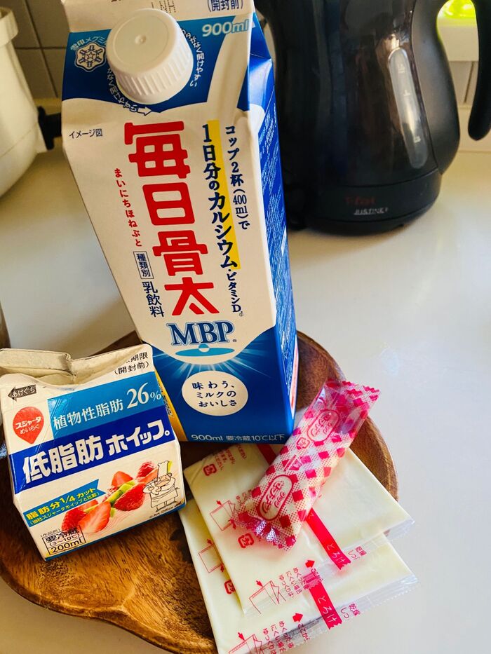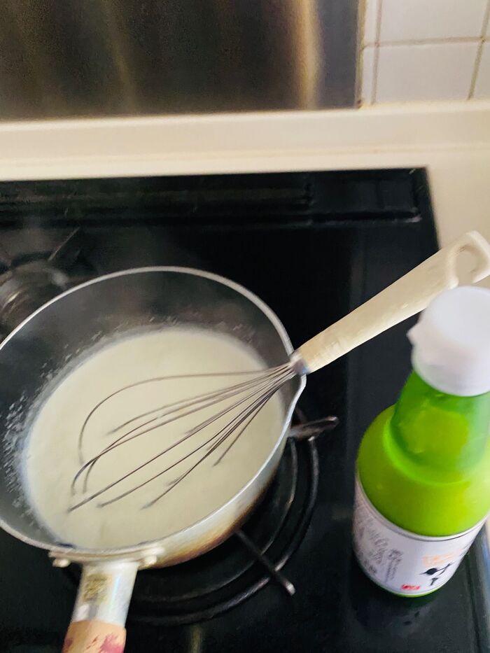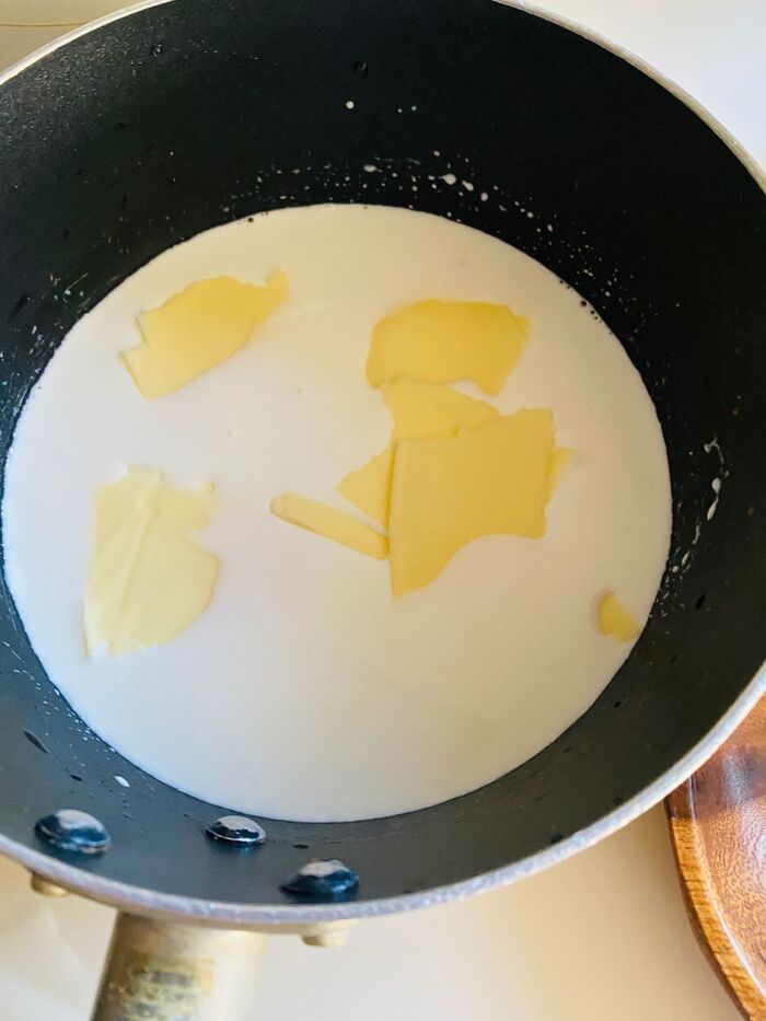 牛乳、ホイップ、砂糖、手でちぎったスライスチーズを入れます。
