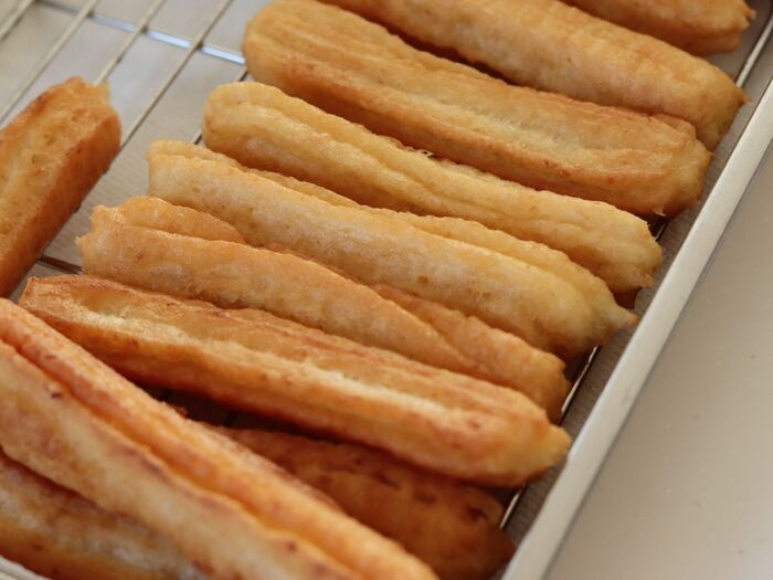 しばらく揚げるとクッキングシートから生地が剥がれやすくなるので、そうなったらクッキングシートを剥がして取り出し、転がしながら全面カリッとこんがりするまで揚げ(3~4分)、バットに取り出しあら熱を取る。