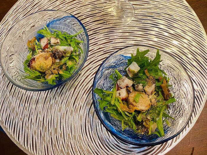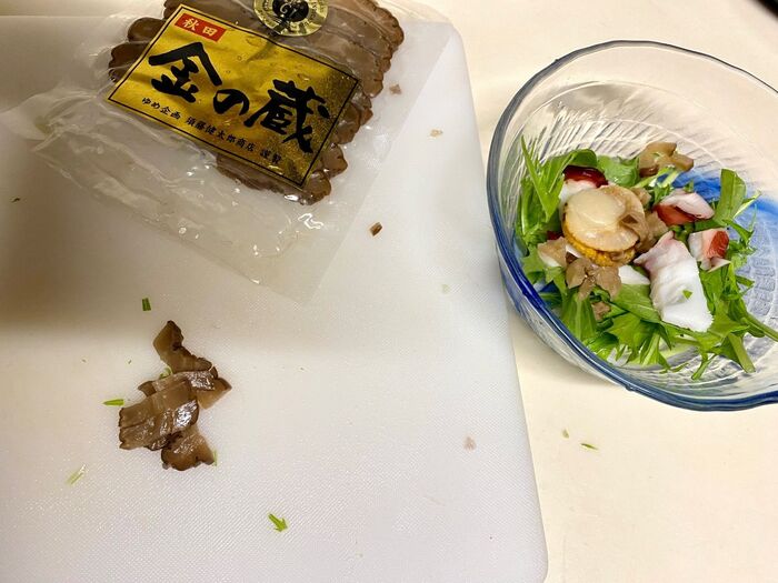 細かく切ったいぶりがっことゆで卵、水菜をマヨネーズで和えて、