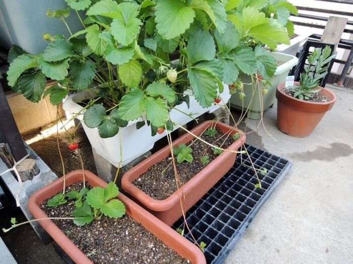 ・花はランナーの切れ端がついている反対側に咲くのでランナーの向きを揃えて植えると管理しやすいです。花が咲くころになるとランナーはどんどん伸びてきますが、実に養分を集中させるため、ランナーは株元からハサミで切り取りましょう。