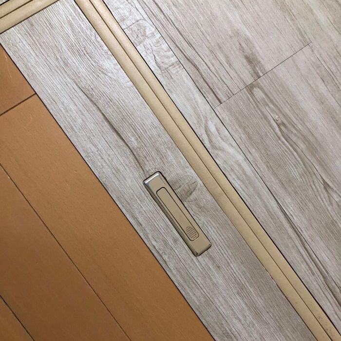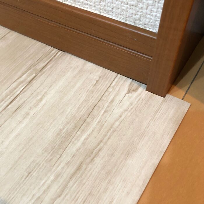 入り口に対し縦方向の方が目の錯覚で広く見えるかな…なんて思ったのですが、しっくりこなかったので、今までの床の木目と同方向に貼ることにしました。