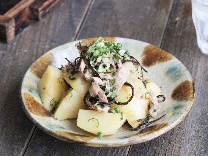 ツナ缶の汁気を軽く切り、食べる直前に じゃがいもに塩昆布とツナと混ぜる。