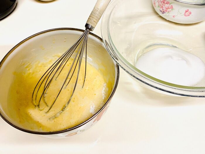 ③卵黄をよく混ぜ、牛乳を加えよく混ぜます。