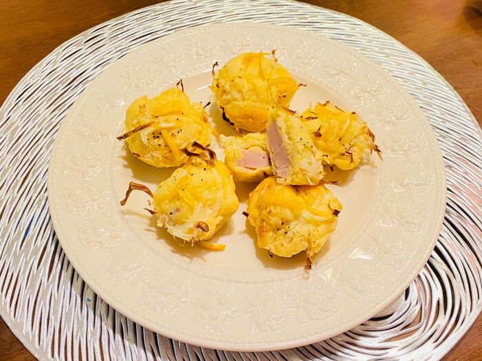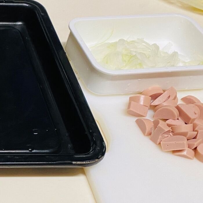 ⑦⑤のおかずカップに⑥の魚肉ソーセージを入れ、