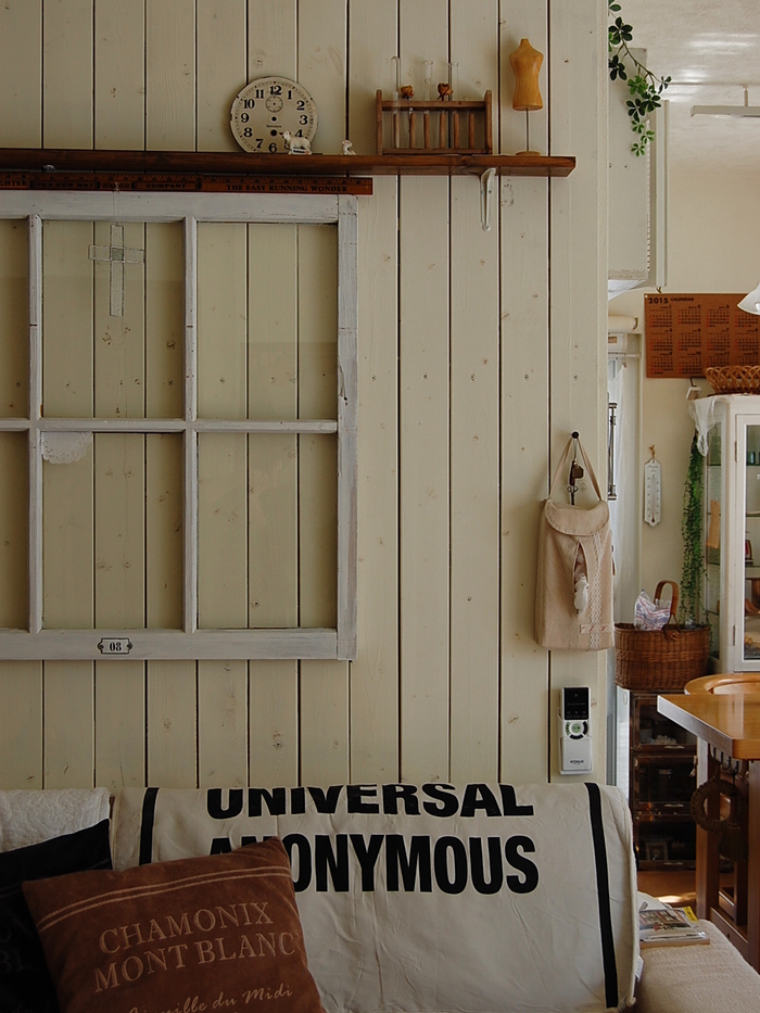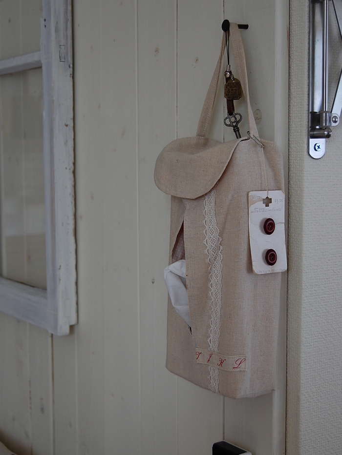 掛けててもインテリアの邪魔にならないような手作りのテッシュケースを下げてます。