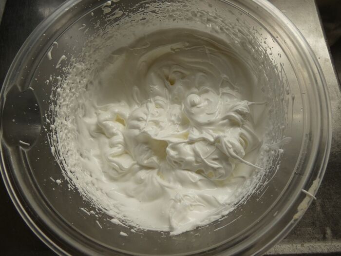 卵黄と卵白に分け、卵白に砂糖の半分を混ぜ合わせ、しっかりつのが立つまで泡立てます。