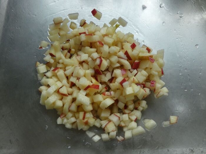 りんごは小さく角切りにします。耐熱容器にりんご、はちみつ、レモン汁を入れ、電子レンジ600wで2分加熱し冷ましておきます