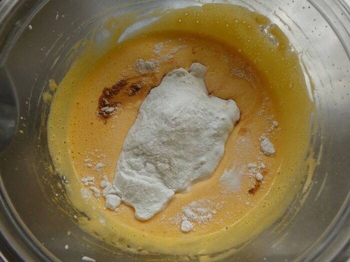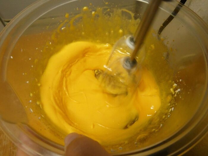 卵黄に残りの砂糖を混ぜ合わせ、白くもったりするまで泡立てます。