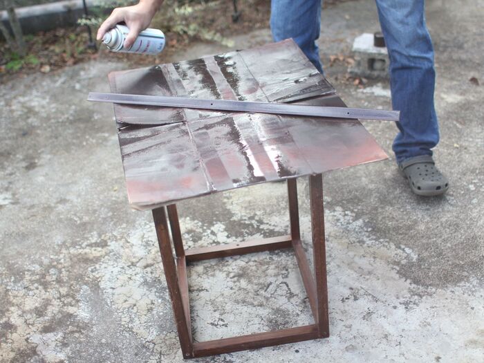 このままでも素敵なんですが、庭のテーブルやいすに合わせてスプレー塗装することに。