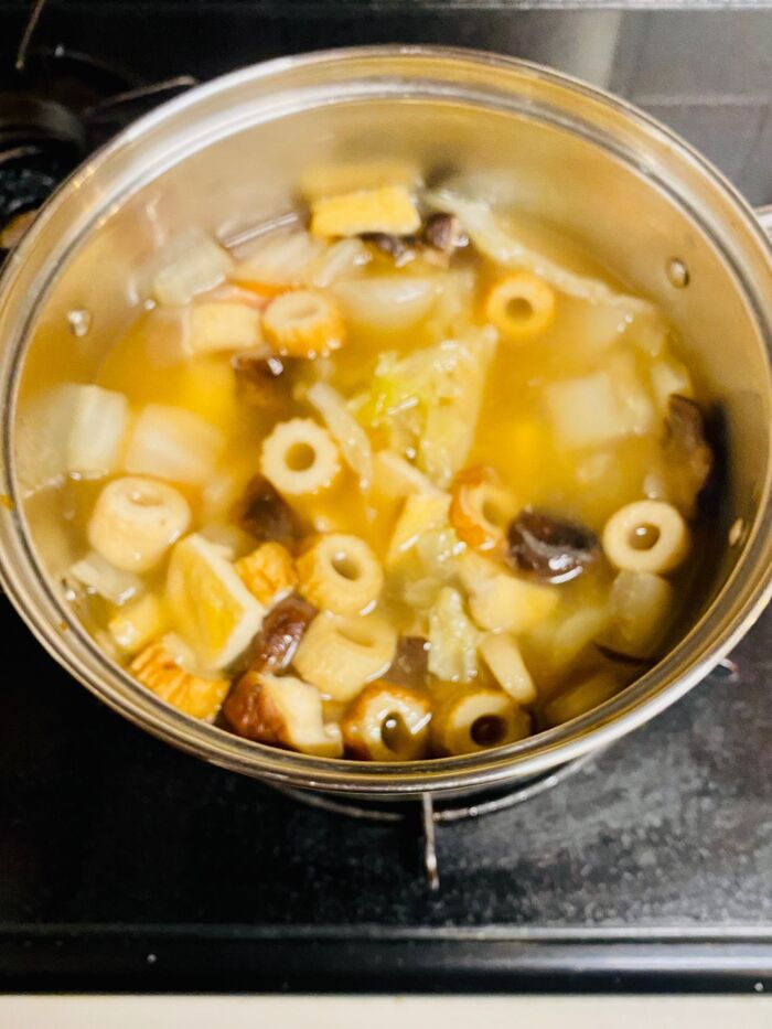 鍋にだし汁を入れ材料が柔らかくなるまで火にかけます。