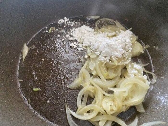 透明になってきたら残りの薄力粉大さじ1を入れ