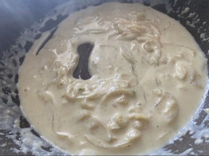 ソースを玉ねぎごとのせ 軽く焼いた白子をのせる