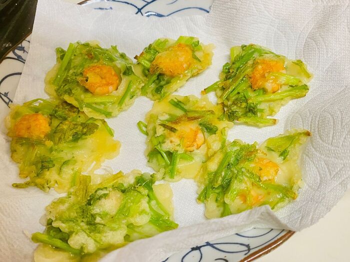 せりとエビのかき揚げ大根おろし、麺つゆ添え