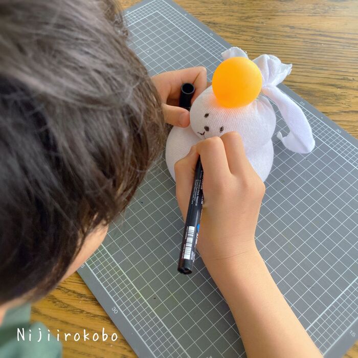 4:ボンドで頭にピンポン玉を接着し、油性ペンで顔を描きこむ。