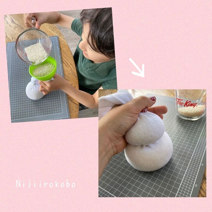 1:靴下の、下から1/3くらいまでお米を多めに入れて、輪ゴムで縛る。