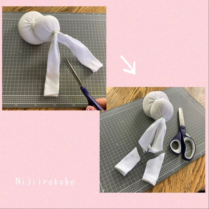 3:靴下の余っている部分をハサミで縦にカットして二股にし、ウサギの耳を作る。(長すぎる場合はさらに切って長さを調整。)