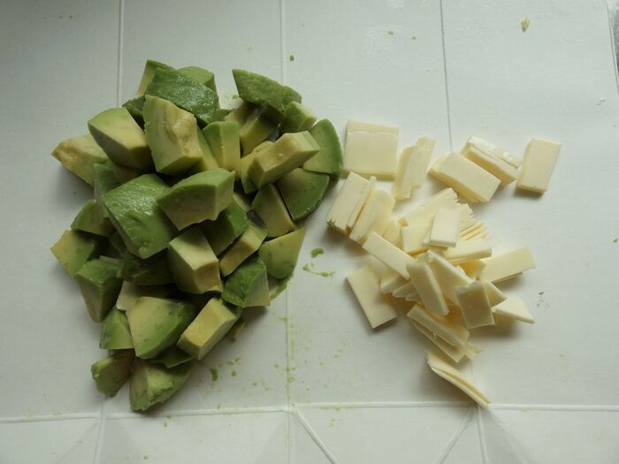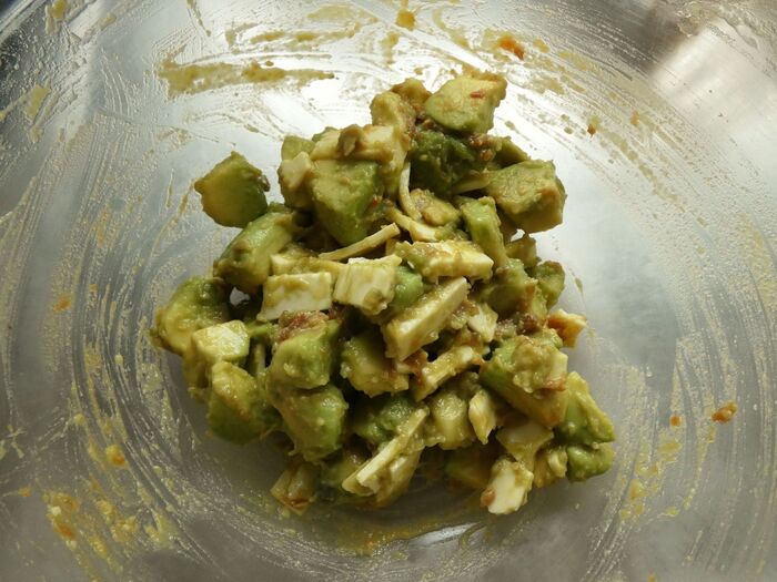 ボウルに味噌と酒を混ぜ合わせ、アボカドとチーズを合わせます。