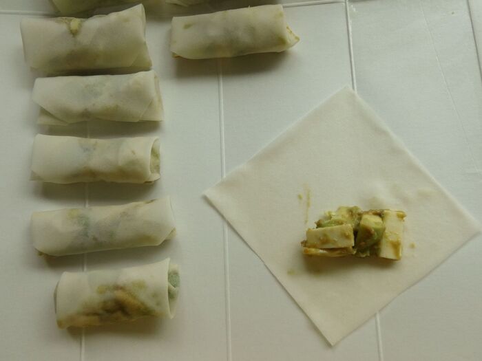 具を春巻きの皮に乗せて巻き、巻き終わりを水溶き小麦粉でとめます。