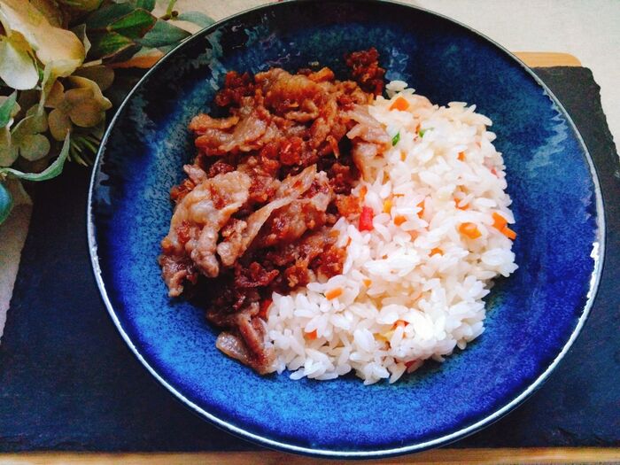 炒めたときはBの水は入れず、フライドオニオンを加えて完成したら、皿ご飯にして。