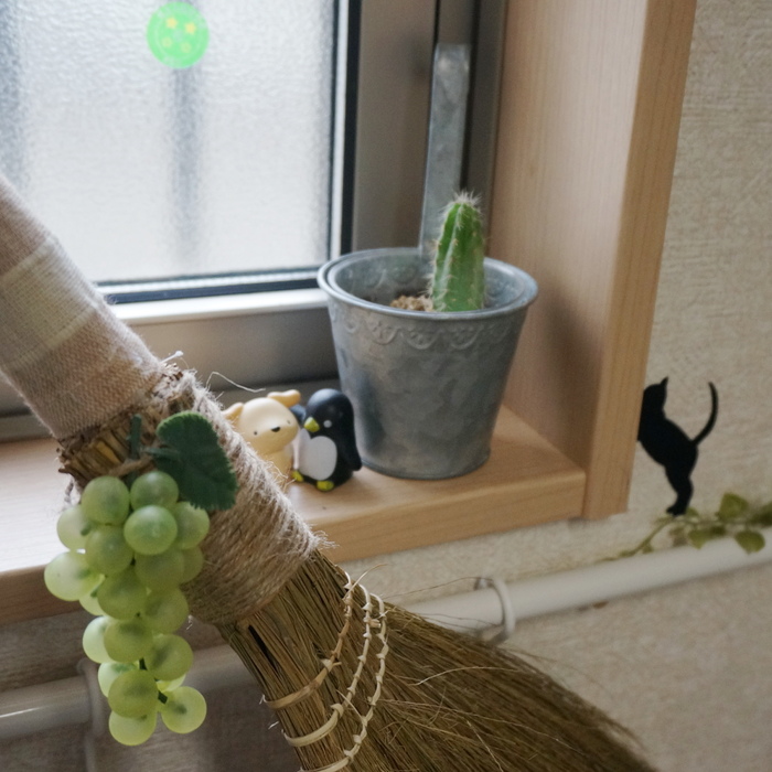 ほうきにも、100均のぶどうを付けてみたり、ブリキの入れ物にサボテンも。
