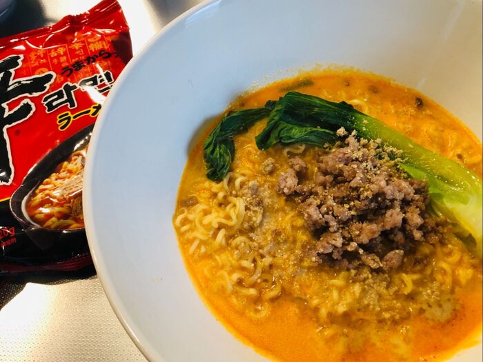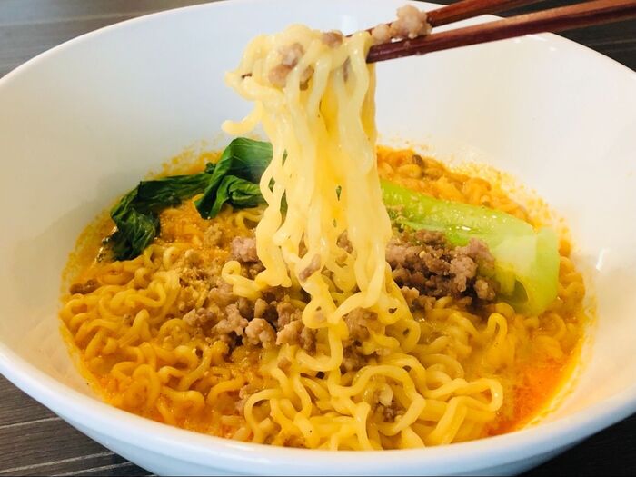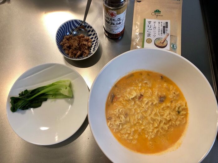 今回は、辛いのそんなにお得意じゃないよ〜って人にも食べてもらえるように、スープの粉を半分だけ使ってミルク坦々麺にアレンジしてみようと思います♪