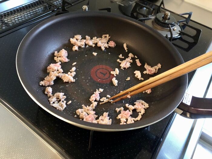 豚ひき肉に塩を振り、フライパンでパラパラになるまで炒めたら取り出しておく。