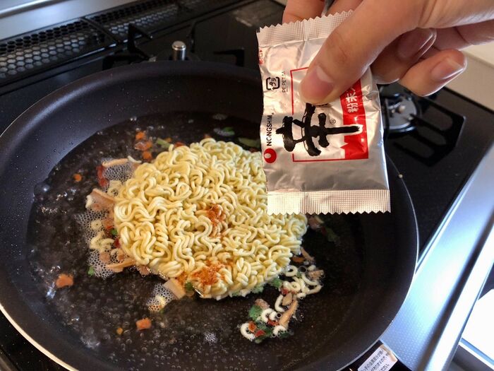 そのままのフライパンに水を入れて沸騰したら、味噌と麺、辛ラーメン付属のかやく全てと、スープの粉半分を入れてパッケージ記載通りに煮込む。