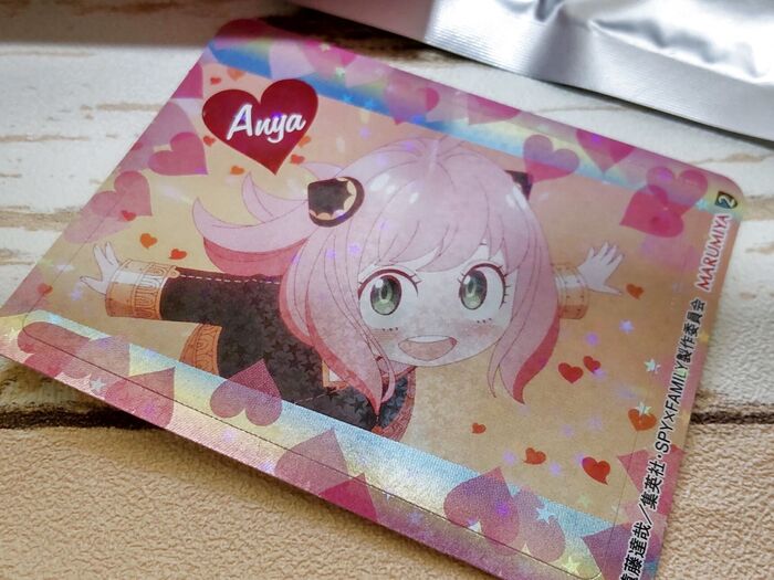 こちらも、ふりかけ同様、こんな絵柄の「SPY×FAMILY」アーニャちゃんのカード型キラキラシールが入っていました!可愛いですね♪