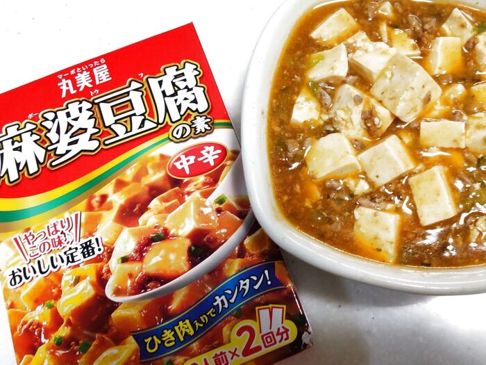 マーボといったら、丸美屋!調味料を配合した、手作りの麻婆豆腐も作りますが、何もしたくない日などは、こちらの丸美屋の麻婆豆腐の素は我が家の定番の商品で、だいたいいつも買い置きをしてあります♪