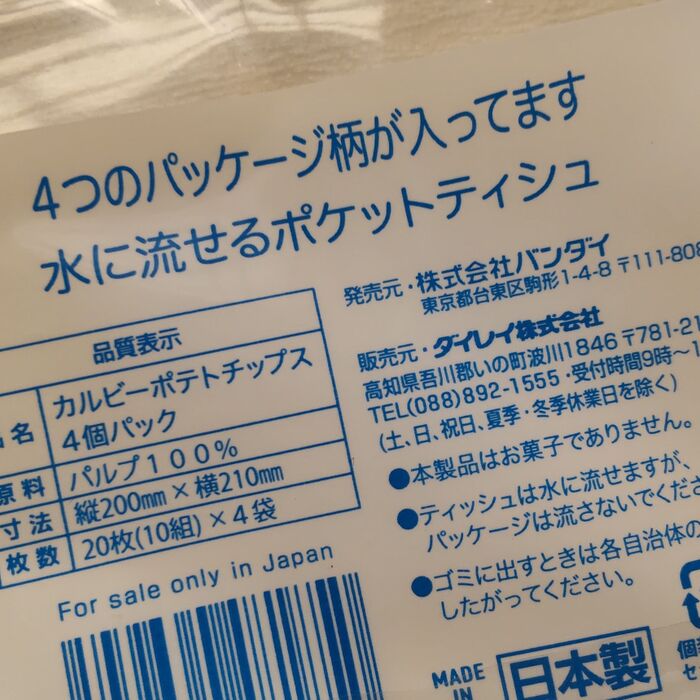 セリアで「ポテチ」と「じゃがりこ」の2種類のテッシュが販売されていました。