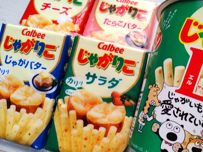 こちらの4種類が入っていましたっ。お家にあった、じゃがりこLサイズを横に並べてみましたよ!