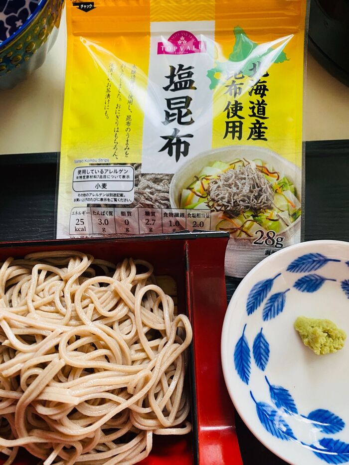 お蕎麦と長芋に、箸で、塩昆布を盛り付けます。