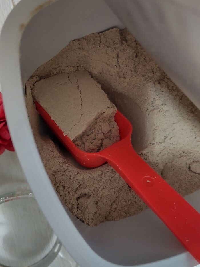 その後にプロテインを付属の赤いスプーンで大さじ1と1/2をはかって加えます