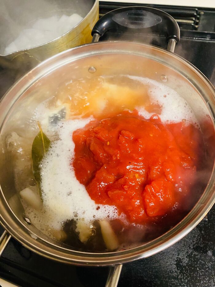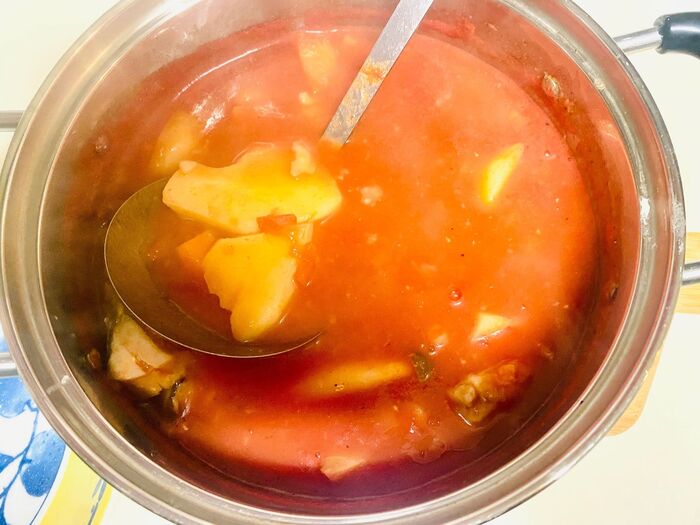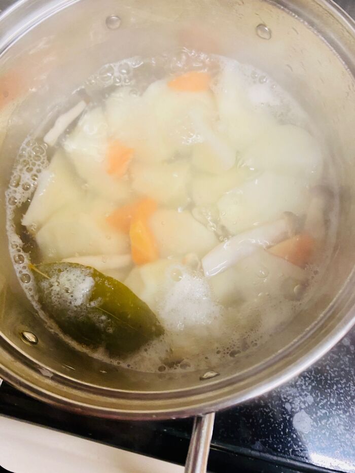 鍋に、じゃがいも、しめじ、にんじん、ローリエ、水を入れ火にかけます。