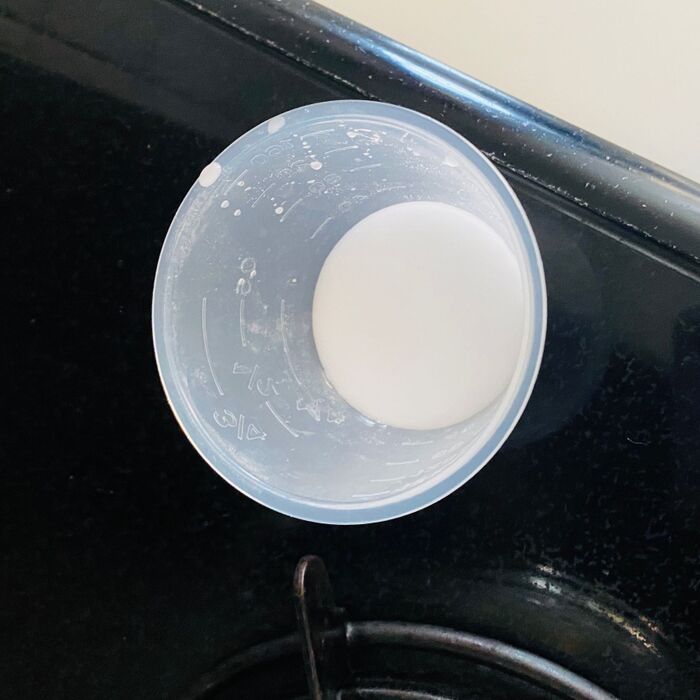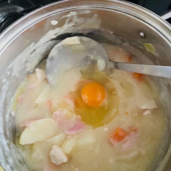 残ったシチューを温め直し、ベーコン、卵をいれ、よく混ぜます。