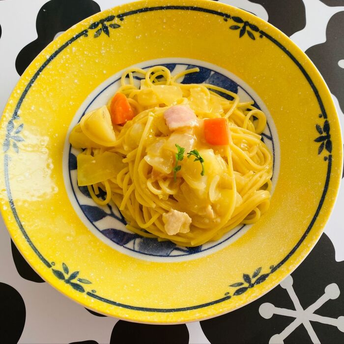 クリームチキンシチューが残っときは、カルボナーラ風パスタにアレンジします。