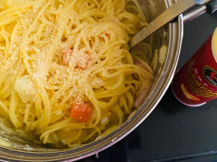 パスタを入れ、パルメザンチーズをたっぷり入れてよく絡めます。