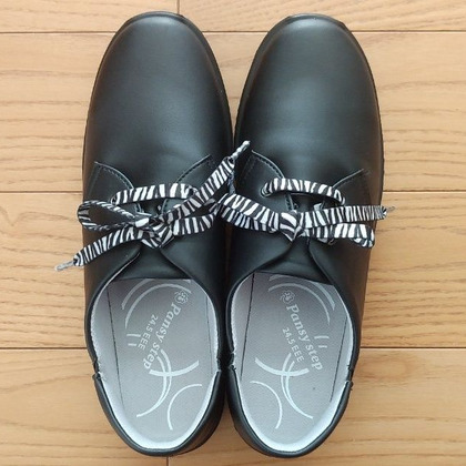 使った靴紐はセリア「伸びーる靴ひも」です。この靴には長すぎたのでカットして、端はテープで留めました。