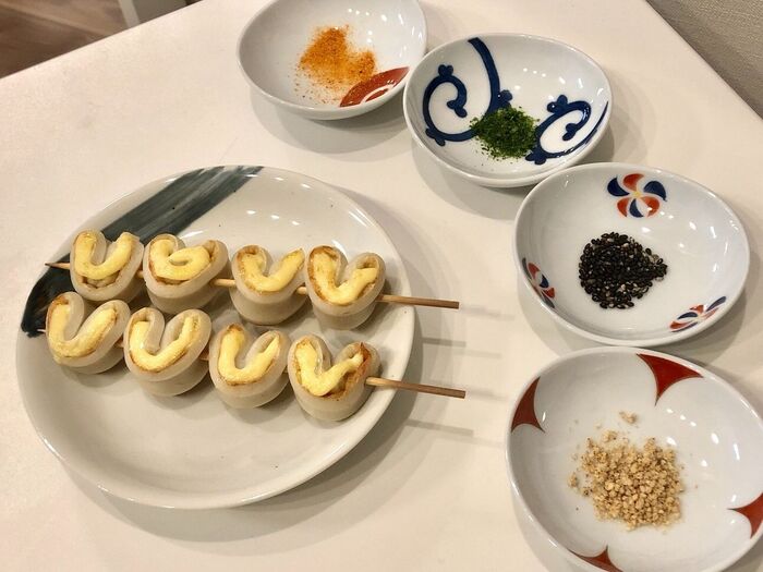 …とは全く違って、ちくわとマヨネーズの香ばしい香りと、ごまやあおさ、七味の香り。