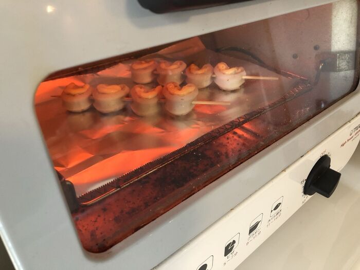アルミホイルに並べて、トースターでマヨネーズがぐつぐつして焼き色がつくぐらいまで加熱します。