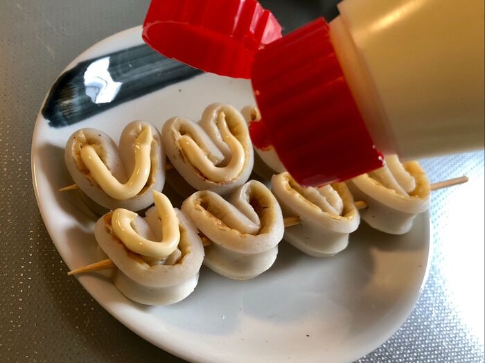 竹串に4個ずつのハートを刺したら、片面にマヨネーズをかけます。