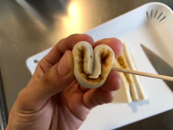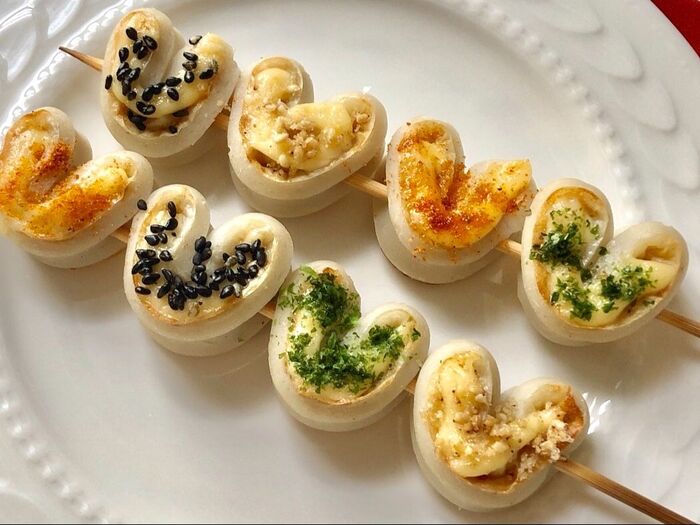 ちくわの内側を外向きにしてハート型に巻いたら竹串に刺します。
