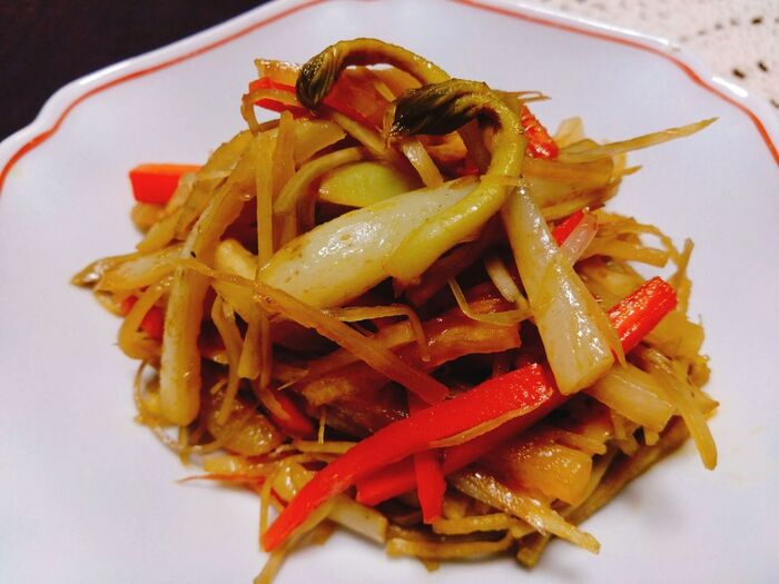 5.大根から水分が出てきたらごぼうを加えて更に炒め最後にウドを加えて炒める。