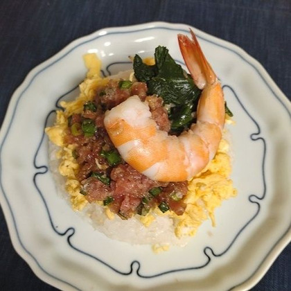 ご飯の上に炒り卵→マグロのたたき→ホウレンソウ→エビを盛り付けてできあがり。