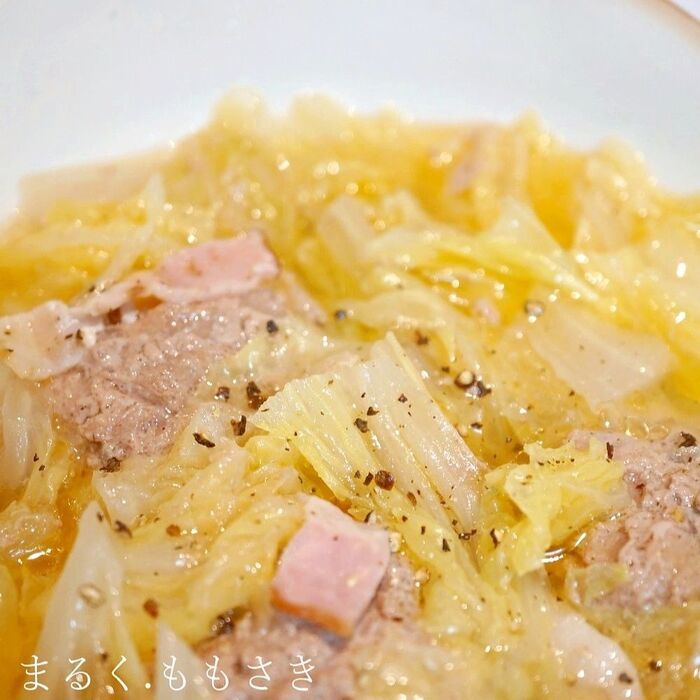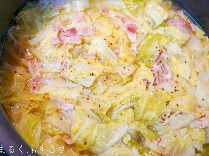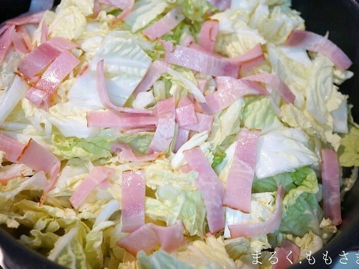 ④上に残りの白菜の葉の部分とベーコンを乗せ蓋をし、中火で沸騰したら弱火で15分程煮込む。