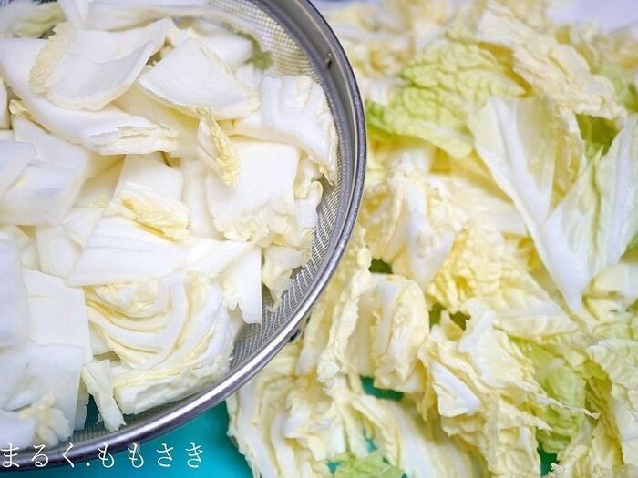 ●白菜はだいたい芯と葉に分け3~4cmに切る。